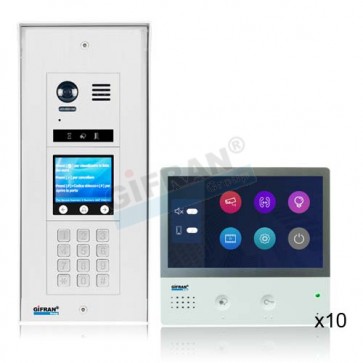 Videocitofono condominiale professionale, funziona con solo 2 fili non polarizzati su linea Bus, composto da pulsantiera ad instalalzione sovrapposta completa di protezione pioggia, 10 Monitor da 7 pollici TFT touch screen, costruito con materiali di prima scelta e le più innovative tecniche di assemblaggio , l'installazione non necessita di lavori murali spesso solo 1,7 Cm si adatta in perfetta armonia con qualsiasi ambiente.